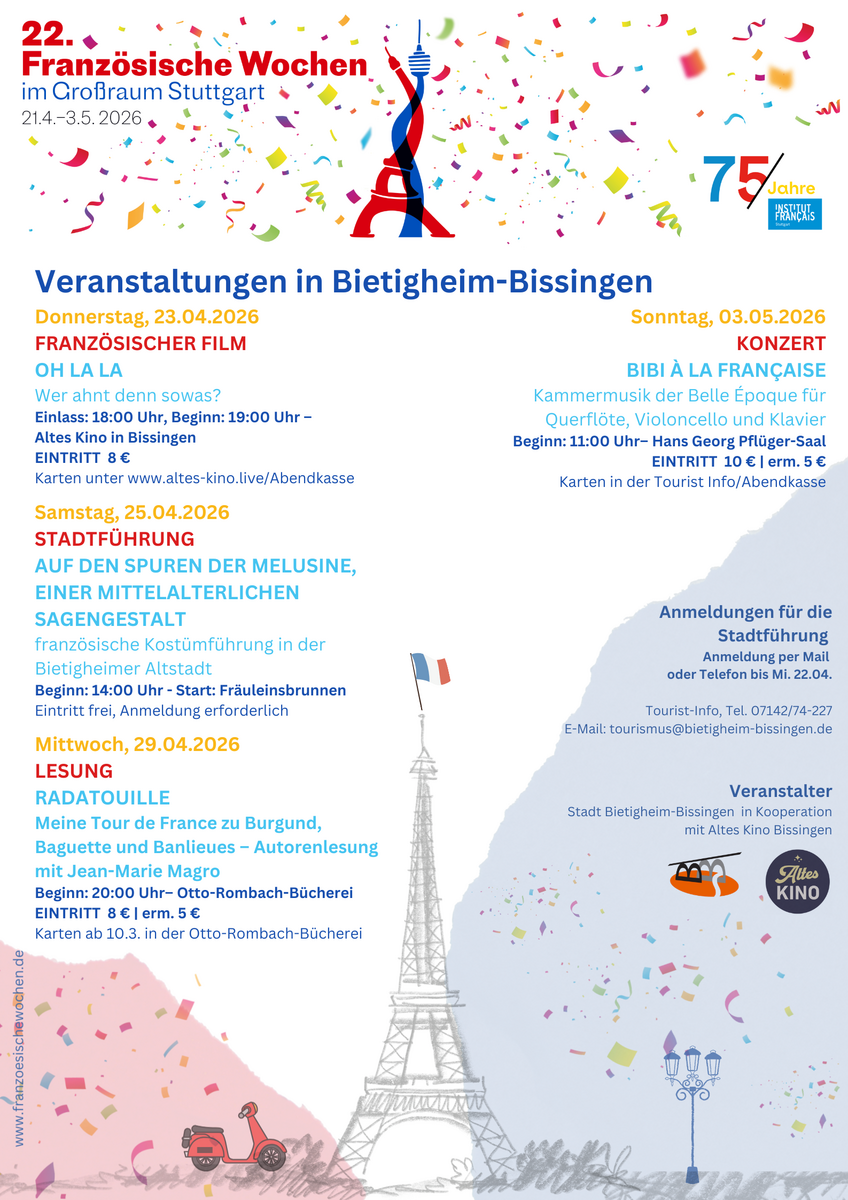 Das gesamte Programm in Stuttgart und Umgebung ist online abrufbar unter www.franzoesischewochen.de. Es ist außerdem als Faltblatt in der Tourist Information in den Marktplatz Arkaden erhältlich.