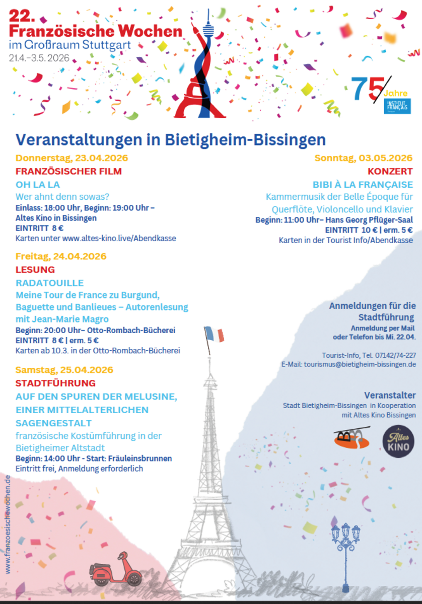 Am Dienstag, 21. April 2026 beginnen die 22. Französischen Wochen im Großraum Stuttgart. 2026 feiert das Institut français in Stuttgart sein 75-jähriges Bestehen. Entsprechend wurde für diese Jubiläumsausgabe der Französischen Wochen das Motto „Ensemble – 75 Jahre deutsch-französische Zusammenarbeit in der Region Stuttgart“ gewählt. Damit sollen die vielfältigen Kooperationen, Städtepartnerschaften und Bildungsprojekte, die über Jahrzehnte hinweg gewachsen sind, besonders gewürdigt werden. Knapp 40 Veranstalter, Vereine, Städte, Schulen und Kulturinstitutionen aus dem gesamten Großraum Stuttgart engagieren sich und bieten ein buntes Programm mit über 70 ganz unterschiedlichen Veranstaltungen für alle Altersgruppen und laden zum deutsch-französischen Dialog ein.