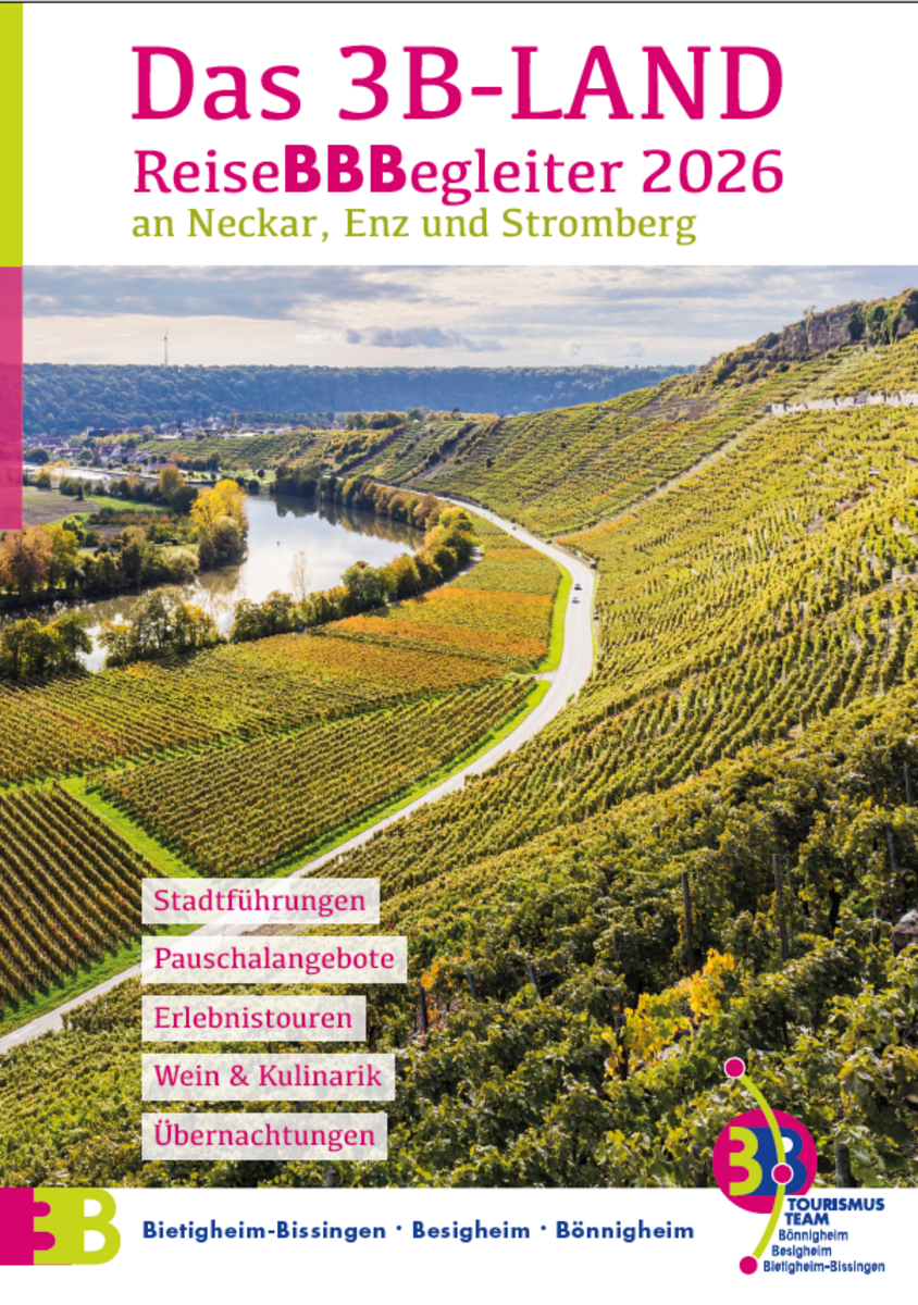 In dieser Woche ist der neue 3B-Reisebegleiter erschienen. Der umfangreiche Erlebnisplaner kann von nun an in den Rathäusern und Tourist-Informationen in Bönnigheim, Besigheim und Bietigheim-Bissingen abgeholt werden.Auf 76 bunten Seiten sind im 3B-Reisebegleiter 2026 Stadt- und Kostümführungen, Ausstellungen und Museen, Wein- und Genusserlebnisse, Wanderungen und Radausflüge, Kanutouren und Vogelkunde, Hotels, Ferienwohnungen und Gastronomie sowie Einkaufstipps in Hofläden und Outlets zusammengefasst. Der Katalog bildet somit für Besucher und Einheimische einen umfangreichen Wegweiser durch das Jahr 2026 im 3B-Land mit seinen Städten Bönnigheim, Besigheim und Bietigheim-Bissingen sowie den Gemeinden Erligheim, Freudental, Gemmrigheim, Hessigheim, Ingersheim, Kirchheim, Löchgau, Mundelsheim und Walheim.