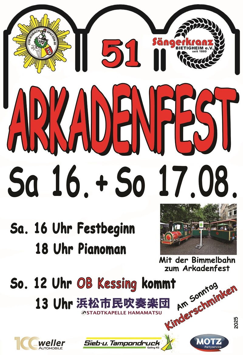 Am Samstag beginnt das Fest um 16 Uhr, um 18 Uhr spielt die Band Pianoman Songs von Billy Joel. Am Sonntag um 12 Uhr kommt OB Kessing vorbei und steht für Gespräche mit interessierten Bürgerinnen und Bürgern zur Verfügung. Um 13 Uhr folgt eine besondere Einlage. Die Stadtkapelle aus Hamamatsu/Japan ist zur Zeit im Ländle und freut sich, einen Gastauftritt auf dem Arkadenfest absolvieren zu können. Die 40 Musikerinnen und Musiker werden ein schwungvolles Programm bieten.