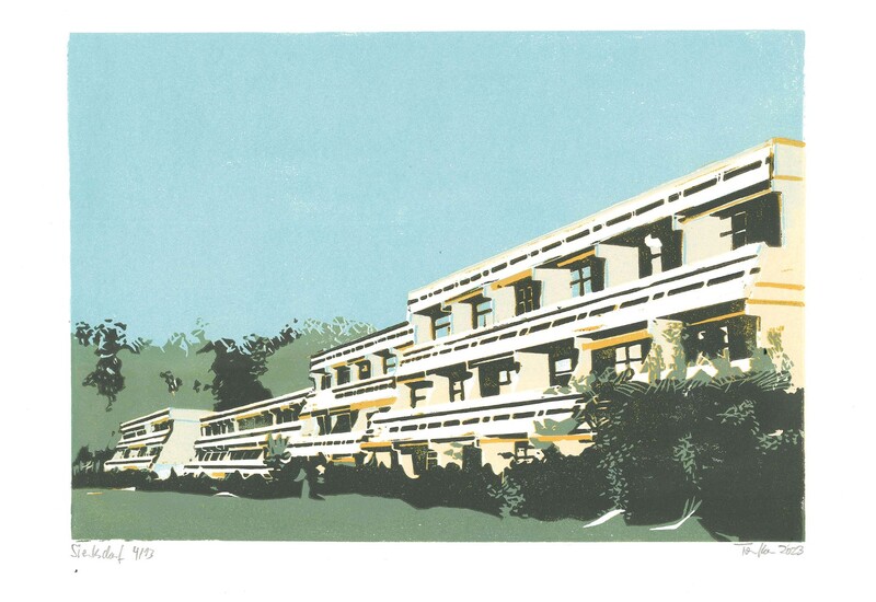 Abbildung: Tom Korn, Sierksdorf aus der 8-teiligen Serie: Ostseemoderne, 2023/24, Farblinolschnitt, ca. 25 x 36 bzw. 36 x 25 cm, Auflage 12–14