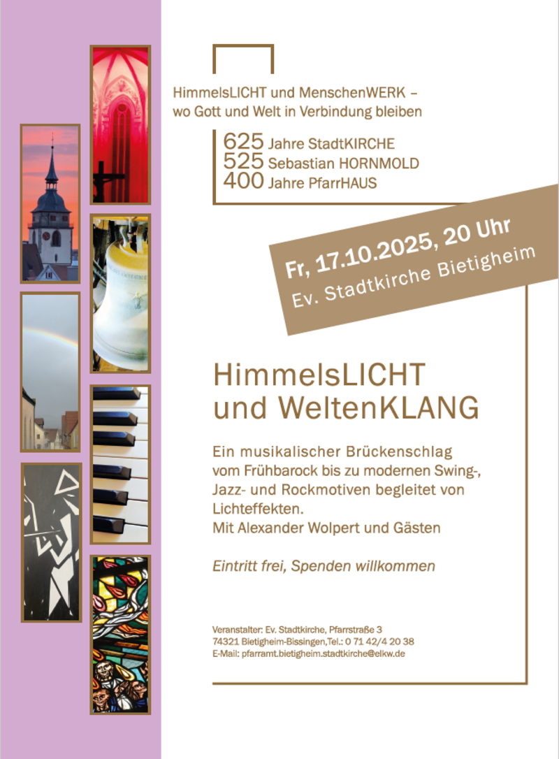 Licht – Klang – Farbe: Unter dem Titel „Himmelslicht und Weltenklang“ lädt die Evangelische Stadtkirche am Freitag, 17. Oktober 2025, um 20 Uhr zu einem ganz besonderen Konzertabend ein. Das musikalische Ereignis ist Teil des großen Jubiläumsjahres „625 Jahre Stadtkirche – 525 Jahre Sebastian Hornmold – 400 Jahre Pfarrhaus“ und zugleich ein Beitrag zum Jubiläum „50 Jahre Bietigheim-Bissingen“.