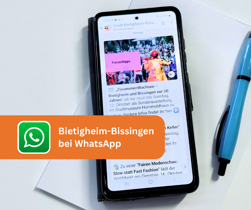 Die städtischen Social Media Accounts der Stadt Bietigheim-Bissingen erreichen bereits mehr als 28.000 Menschen. Ab sofort werden die Neuigkeiten der Stadt Bietigheim-Bissingen auch auf dem WhatsApp Kanal der Stadt Bietigheim-Bissingen zu finden sein. Mehrmals wöchentlich erhalten die Abonnenten Informationen zu Verkehrsmeldungen, dem Stadtgeschehen, dem Kulturprogramm, Angeboten für Kinder und sonstige hilfreiche Infos. Die Meldungen werden in Form von Texten, Bildern, Videos und weiterführenden Links kostenfrei zur Verfügung gestellt. „Die Erweiterung der städtischen Kommunikationskanäle um WhatsApp bringt uns in der digitalen Bürgerinformation weiter voran. Wir hoffen, damit noch mehr Menschen direkt und schnell erreichen zu können.“, so Oberbürgermeister Jürgen Kessing.