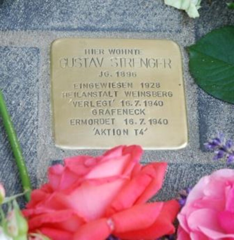 Vom Hornmoldhaus aus geht es zu den sechs Stolpersteinen, die für Opfer der sogenannten Euthanasie im Stadtgebiet von Bietigheim verlegt wurden. Der erste Stolperstein befindet sich in der Hindenburgstraße 16 in der Nähe der Hillerschule und wurde für Karl Binder verlegt. Es folgt der Stolperstein für Frida Ziegelmaier in der Pfarrstraße 6 bei der Bietigheimer Stadtkirche. Wenige Meter weiter wird an Erna Unkel, Bei der Kelter 14 gedacht. Ebenfalls in kurzer Entfernung folgen die Stolpersteine für Karl Reinhard in der Weinstraße 4 und Walter Hass in der Fräuleinstraße 4. Von der Altstadt geht es ins Aurain-Gebiet, wo in der Ringstraße 8 der ehemalige DLW-Arbeiter Gustav Strenger seinen letzten Wohnsitz in Stadt hatte, bevor er in Grafeneck vergast wurde.