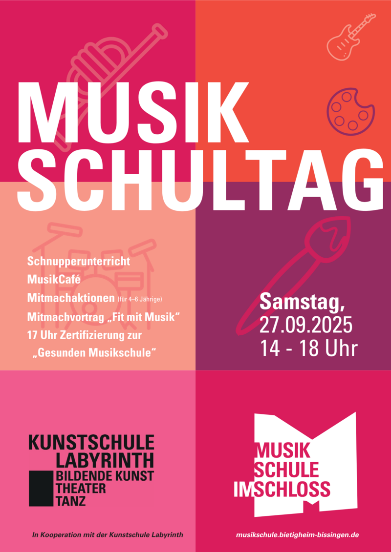 Am Samstag, 27. September 2025 öffnet die Musikschule im Schloss Bietigheim-Bissingen beim diesjährigen Musikschultag ihre Türen. Zwischen 14 und 18 Uhr dürfen Kinder und Jugendliche jeden Alters, und natürlich auch die Eltern, Großeltern und andere Besucher sich umschauen und informieren, was die Musikschule alles zu bieten hat.