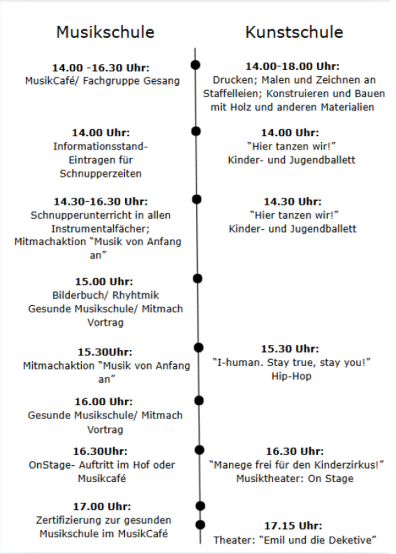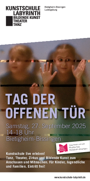 Kinder, Jugendliche und ihre Familien sind am 27. September 2025 zum gemeinsamen Tag der offenen Tür von Musikschule im Schloss und Kunstschule Labyrinth in Bietigheim-Bissingen eingeladen. Besucherinnen und Besucher erwartet ein kunterbuntes Programm zum Anschauen, Ausprobieren und Mitmachen. Während Interessierte bei der Musikschule bei Schnupperunterrichten alle Instrumental- und Gesangsfächer kennenlernen und EMP-Präsentationen und Darbietungen im Musikcafé besuchen können, gibt es bei der Kunstschule nebenan Kindertanz, Hip-Hop, verschiedene Kunstwerkstätten, Zirkus und Theater. Auch das gemeinsame Musical-Projekt von Musik- und Kunstschule, „on stage“ ist mit einer Performance zu hören und zu sehen. Besucherinnen und Besucher erwartet ein buntes Fest der Künste, der Eintritt ist frei.