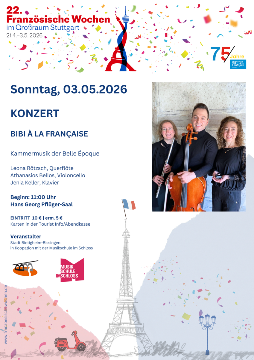 Den Abschluss der Veranstaltungsreihe macht am Sonntag, 03. Mai 2026 ein besonderes klassisches Konzert im Bietigheimer Schloss: BiBi à la française – Kammermusik der Belle Époque für Querflöte, Violoncello und Klavier.