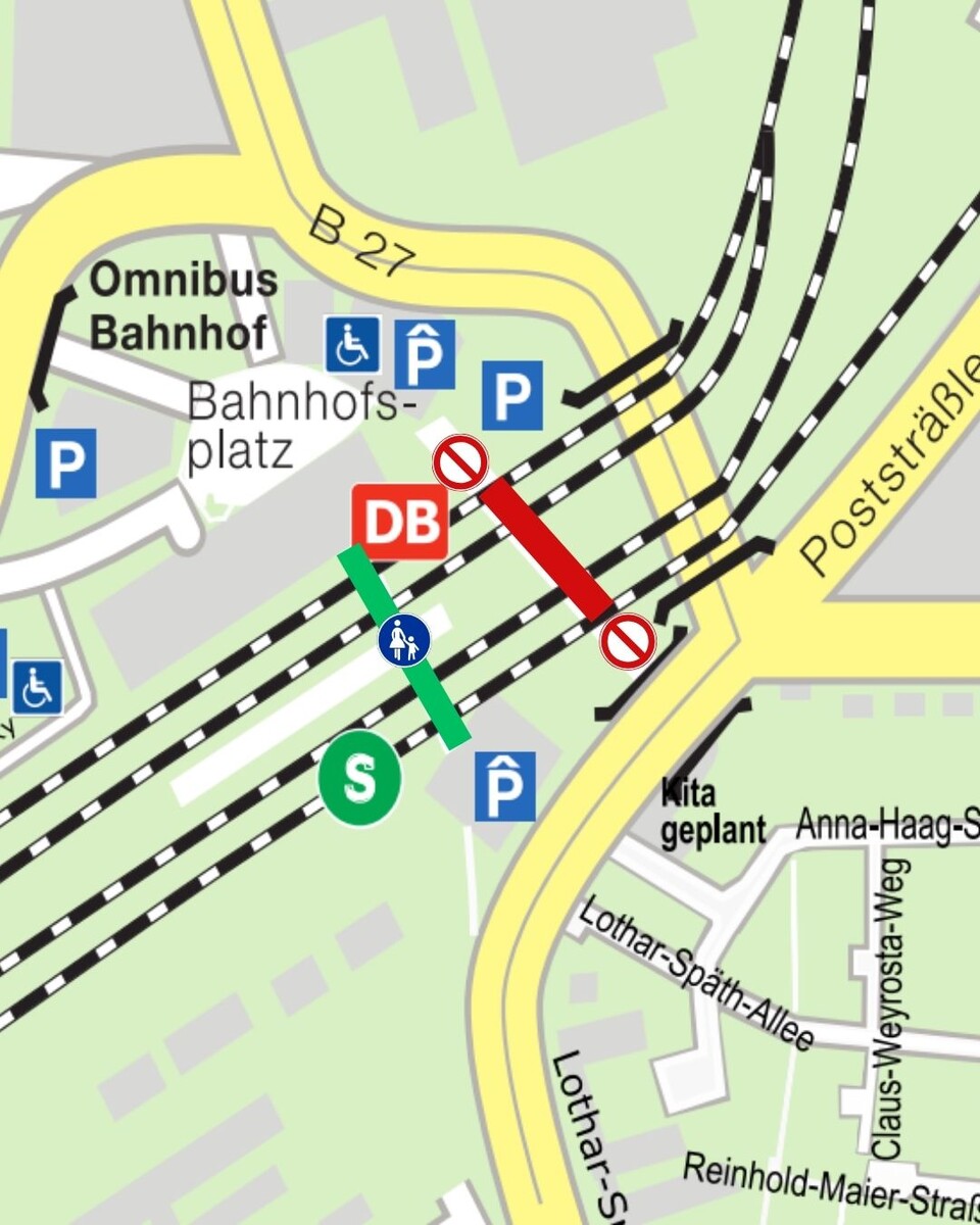 Die Fußgänger können die Bahnunterführung und die neu hergestellte Lichtsignalanlage am Parkhaus Stuttgarter Straße verwenden, um Richtung Buch zu gelangen.