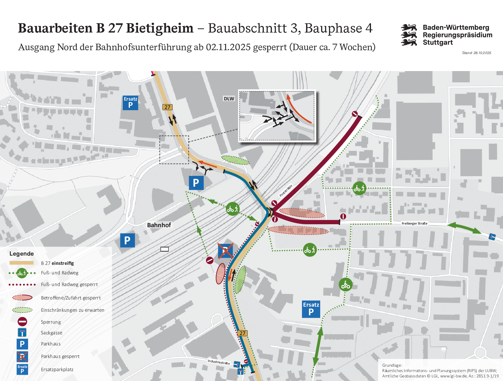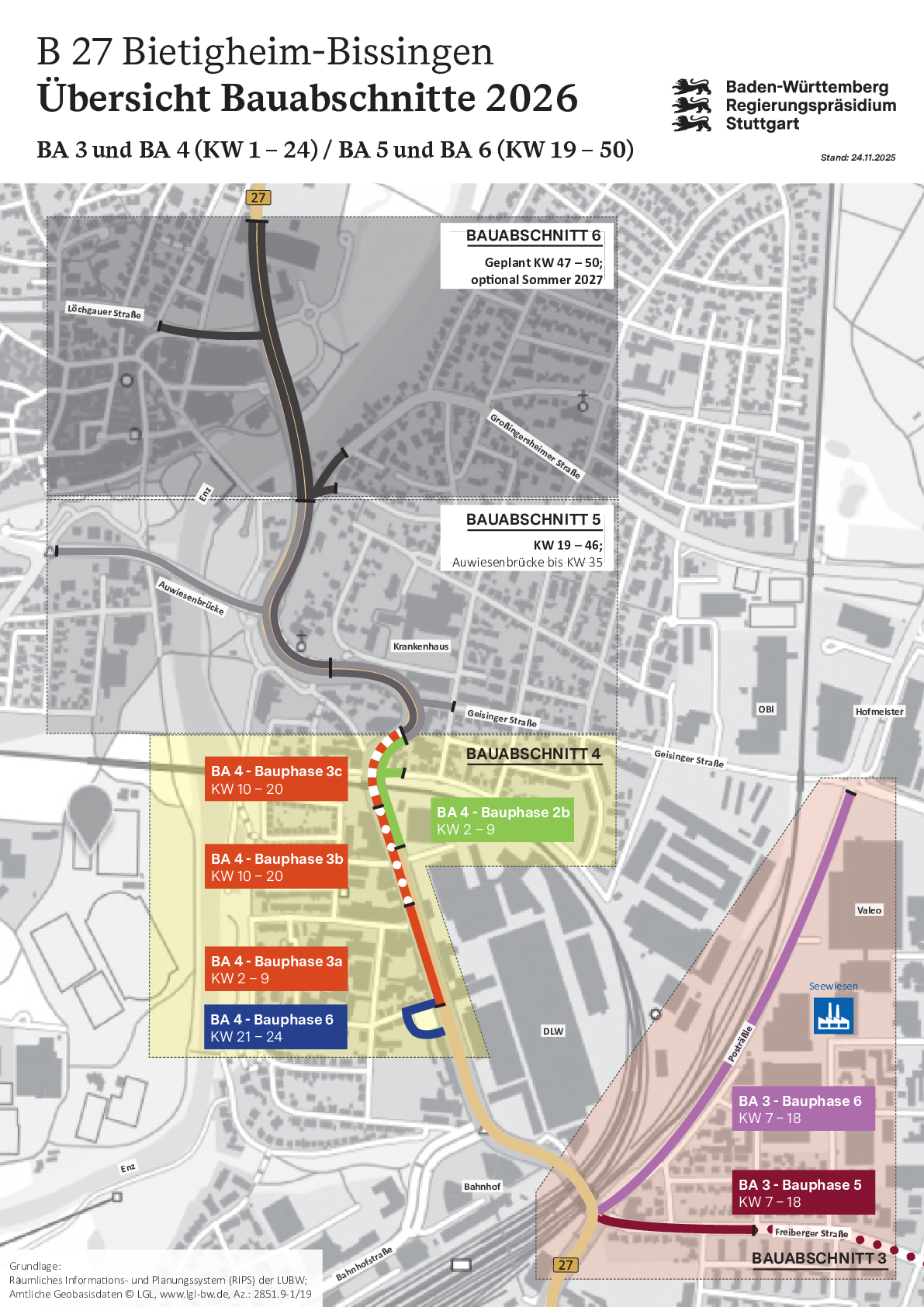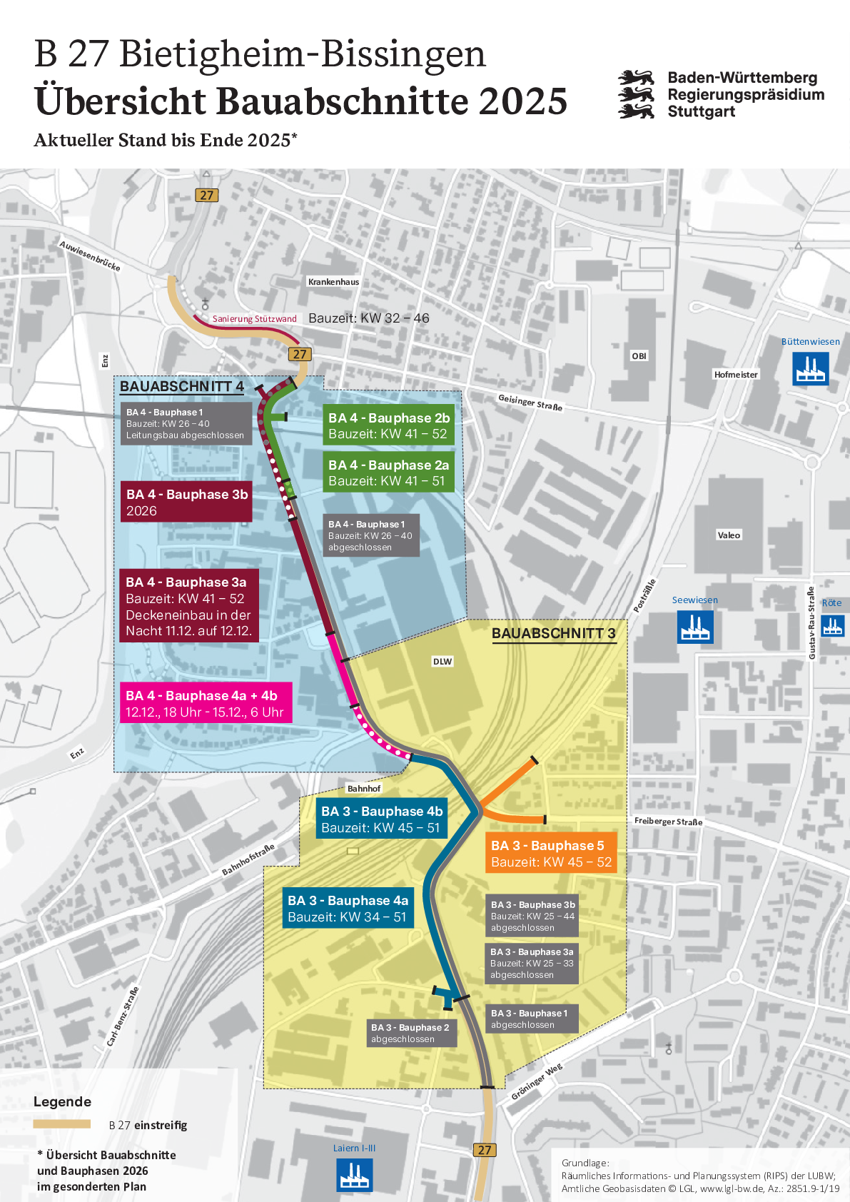 - Pressemitteilung vom 12.06.2025: B 27- Sanierung der Ortsdurchfahrt Bietigheim-Bissingen Start im Bauabschnitt 4 sowie Beginn der Bauphase 3 im bereits laufenden Bauabschnitt 3 ab 16. Juni 2025 161 KB