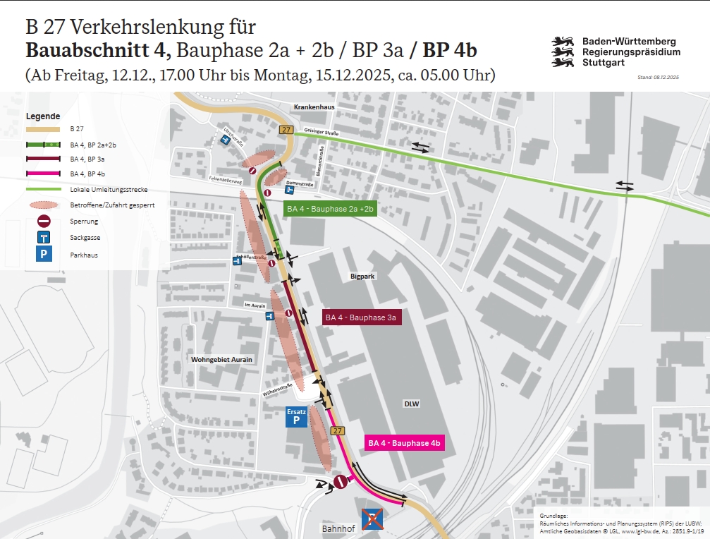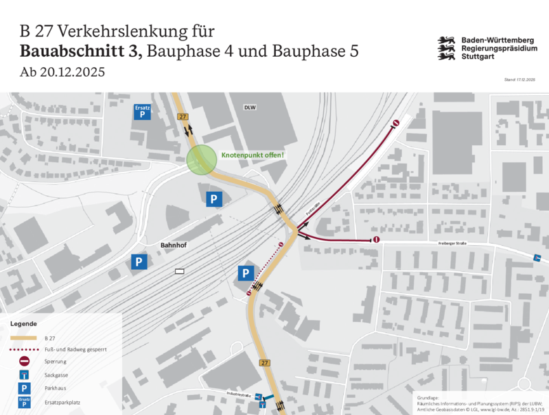 - Pressemitteilung vom 10.12.2025: Letzte Bauphase in 2025: Vollsperrung der Bahnhofstraße im Knotenpunkt zur B 27 vom 12. bis zum 15. Dezember 2025167 KB