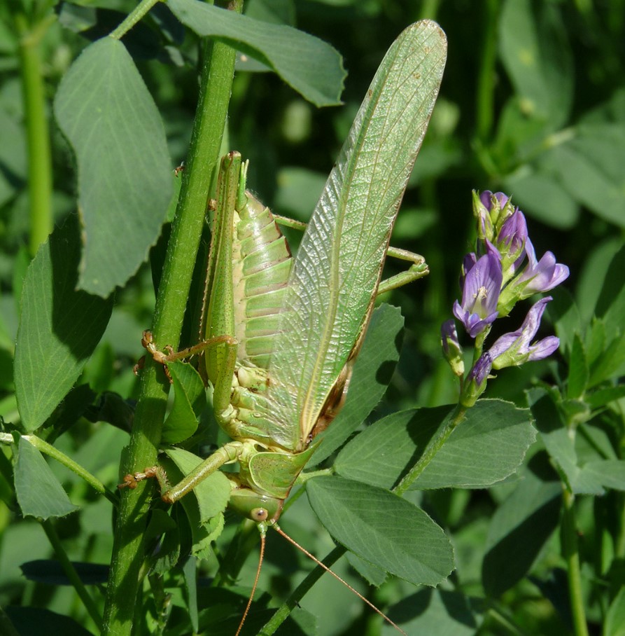 Mit einer Länge von rund vier Zentimetern zählen Heupferde zu den größten heimischen Heuschrecken. Heupferde sind gute Flieger, legen meistens aber nur Kurzstrecken zurück. Die grün gefärbten, gelegentlich auch gelbbraun schimmernden Insekten kommen von Juli bis Oktober auf Wiesen, Feldern sowie in Wäldern vor. Sie ernähren sich hauptsächlich von kleinen Insekten wie Fliegen, Raupen und kleinen Schmetterlingen, aber auch von Pflanzen. Das Männchen zirpt fast unentwegt.
