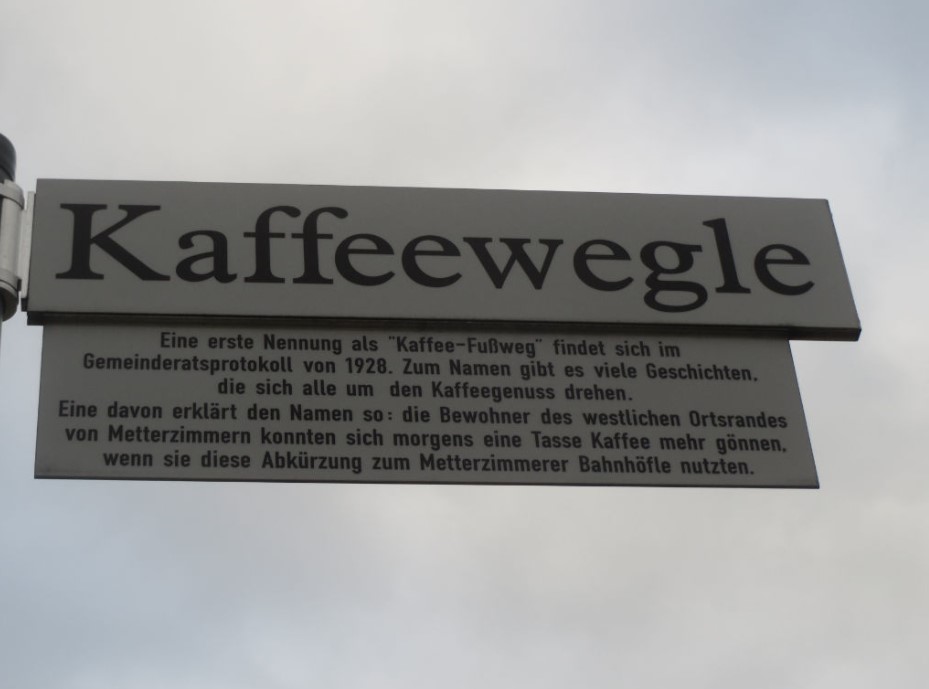 Eine erläutert, dass sich die im Westen des Dorfes wohnenden „Zemmrer“ (wie sich eingesessene Metterzimmrer selbst nennen) vor dem Weg zur Arbeit eine Tasse Kaffee mehr gönnen konnten, wenn sie diesen (kürzeren) Weg zur Arbeit nahmen. Noch heute ist das Kaffeewegle älteren Dorfbewohnern als Teil der „Rennstrecke zum Bahnhöfle“ in Erinnerung.