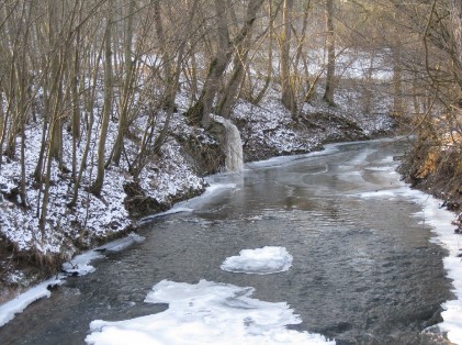 Auf der Brücke stehend sieht man – flussaufwärts blickend – einen kleinen „Wasserfall“ zur Metter. Hier mündet das Wasser der Sachsenheimer Quelle „Höllbrunnen“ in die Metter.
