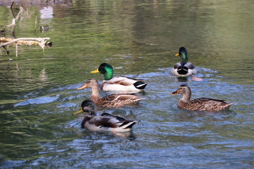 Häufigste heimische Entenart. Die bis etwa 58 Zentimeter große Stockente gehört zu den Schwimmenten, die gründelnd mit dem Schwanz nach oben Nahrung suchen, während die Tauchenten (z.B. Reiherente, Tafelente) völlig untertauchen. Das Männchen ist gekennzeichnet durch einen glänzend gründen Kopf mit weißem „Halsring“ und eine dunkelbraun bis hellbraun gefärbte Brust. Das Weibchen ist schlichter, bräunlich-gräulich gefärbt; trägt aber wie das Männchen ebenfalls einen auffälligen blauen Flügelspiegel.